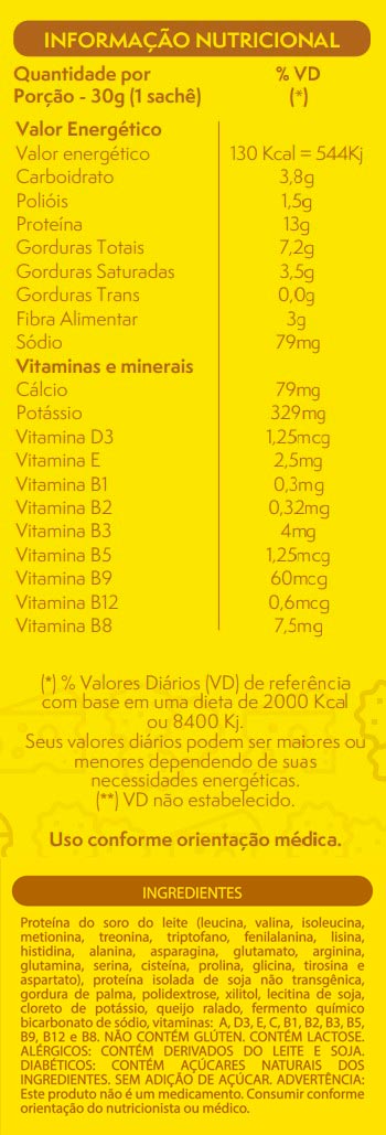 Salgadinho Sabor Queijo (Produto pronto para o consumo) Caixa com 7 refeições CONSULTE VALORES Tabela Nutricional e Ingredientes Comprar